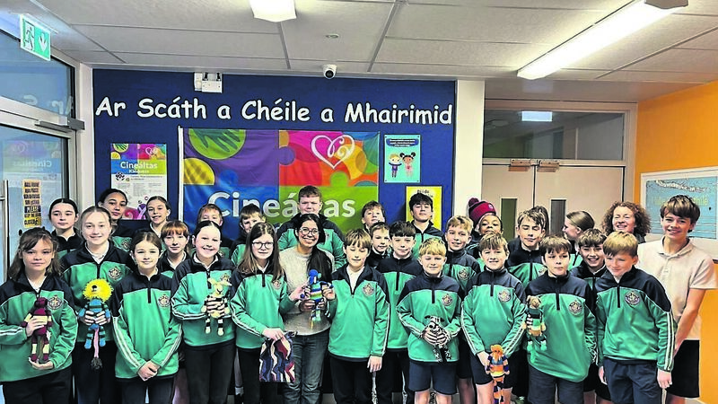 Fifth class at Gaelscoil Mhichíl Uí Choileáin, with activist Paula Ferro in January, as part of the Our World Awards scheme