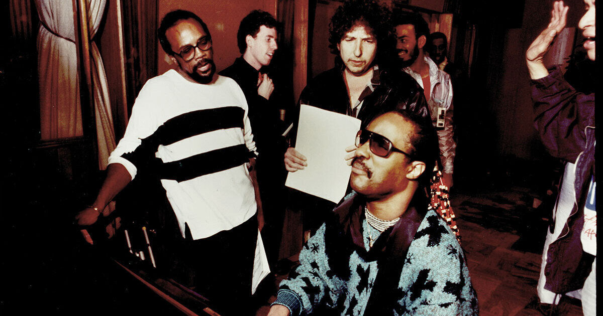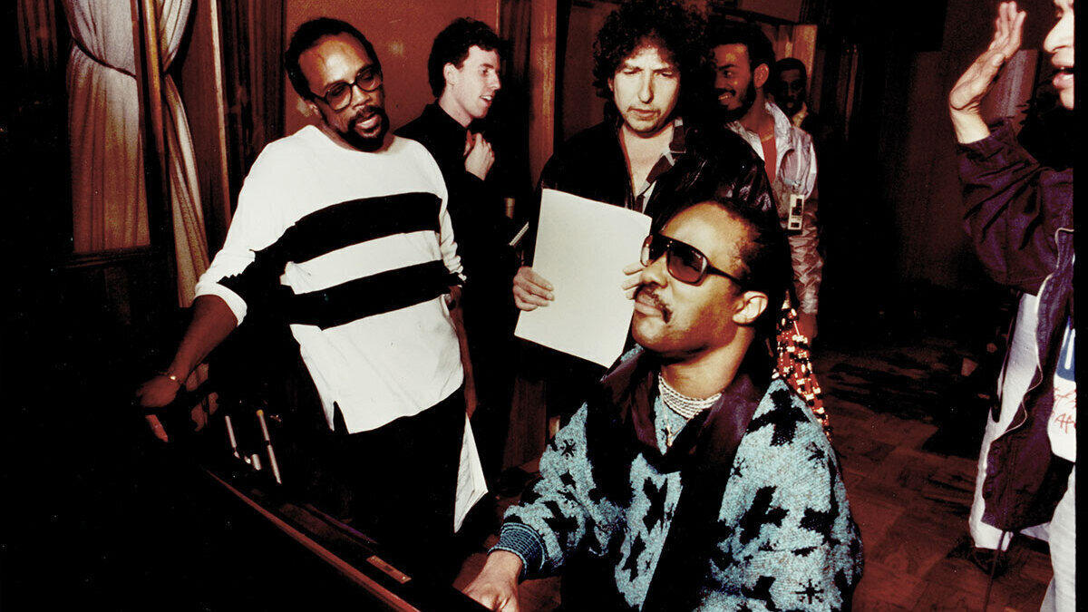 Stevie Wonder, Quincy Jones, and Bob Dylan recording ‘We Are the World’ in aid of Ethiopia in 1985.