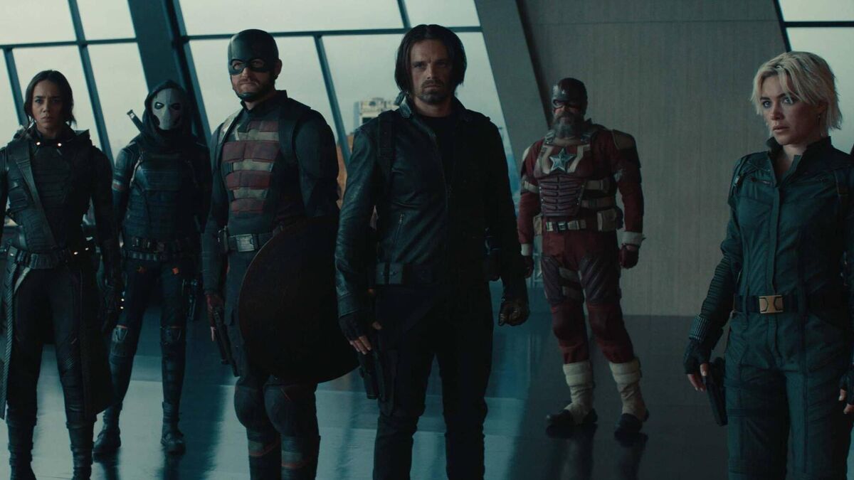 ’Thunderbolts*’ cast : Ghost (Hannah John-Kamen), Taskmaster (Olga Kurylenko), John Walker (Wyatt Russell), Bucky Barnes (Sebastian Stan), Alexei Shostakov/Red Guardian (David Harbour), and Yelena Belova (Florence Pugh). Pictures: Courtesy of Marvel Studios