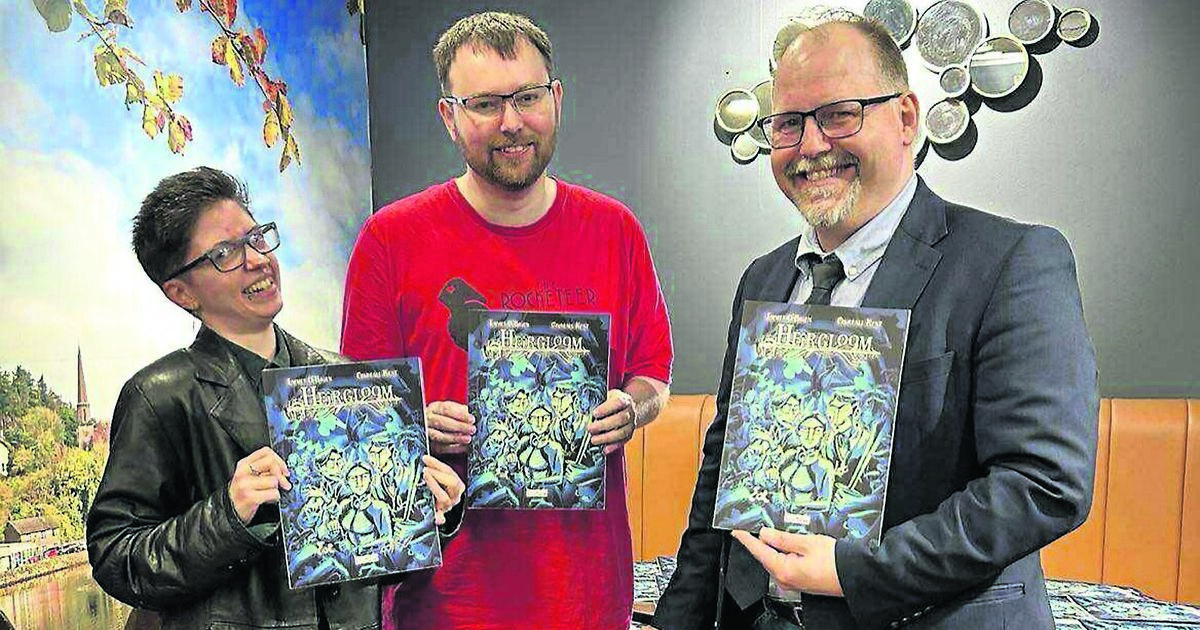 Emmet O’Brien with the graphic novel Heirgloom, with Coireall Kent (left) and Charlie A. Aabo (right)