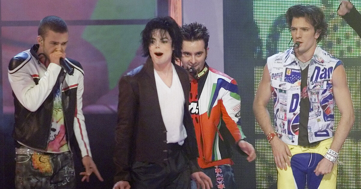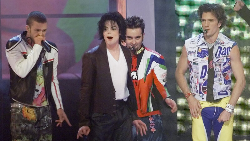 Michael Jackson, second left, performs with 'N Sync during the 2001 MTV Video Music Awards at New York's Metropolitan Opera House. Left to right, Justin Timberlake, Jackson, Joshua "JC" Chasez, and Chris Kirkpatrick. (AP Photo/Beth A. Keiser)