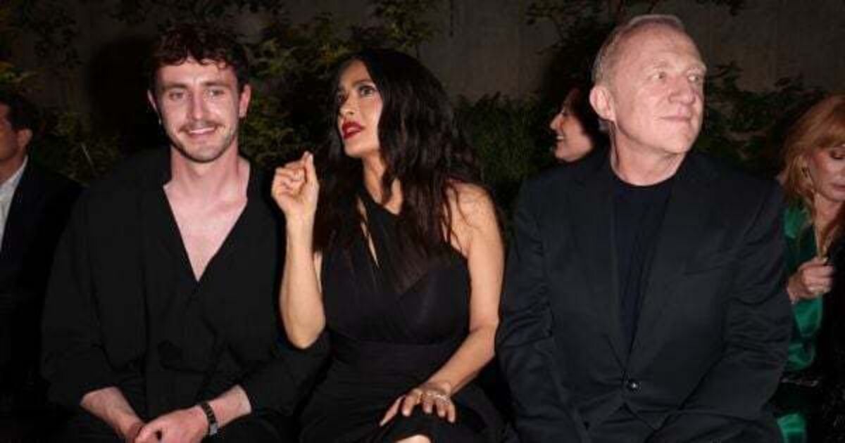 Mescal was sat between actor Salma Hayek and her husband, Francois-Henri Pinault, who is chair and chief executive of Kering, Gucci’s parent company, and Gucci front-row favourite, singer Solange, who matched the set in a glittering green dress.