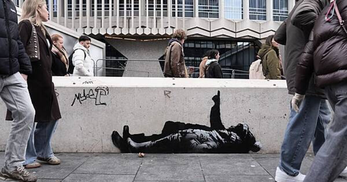 Two people lie on the ground looking up at a London skyscraper in the latest artwork thought to be by graffiti artist Banksy.