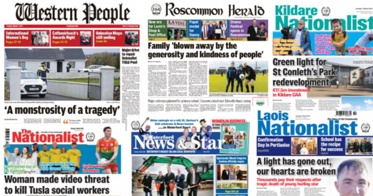 The Laois Nationalist leads with a report from the funeral of tragic young hurling player Alan Kirwan: "He was the brightest star in our sky, because he had a really special way of making everybody feel good about themselves. Put simply, he had the ability to spread happiness wherever he went."
