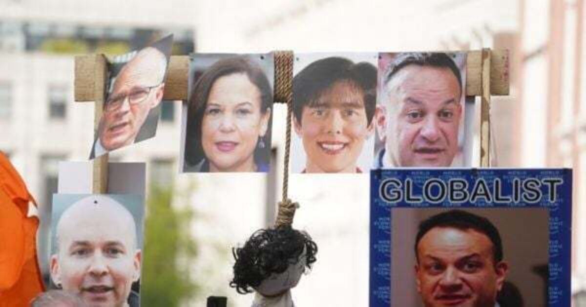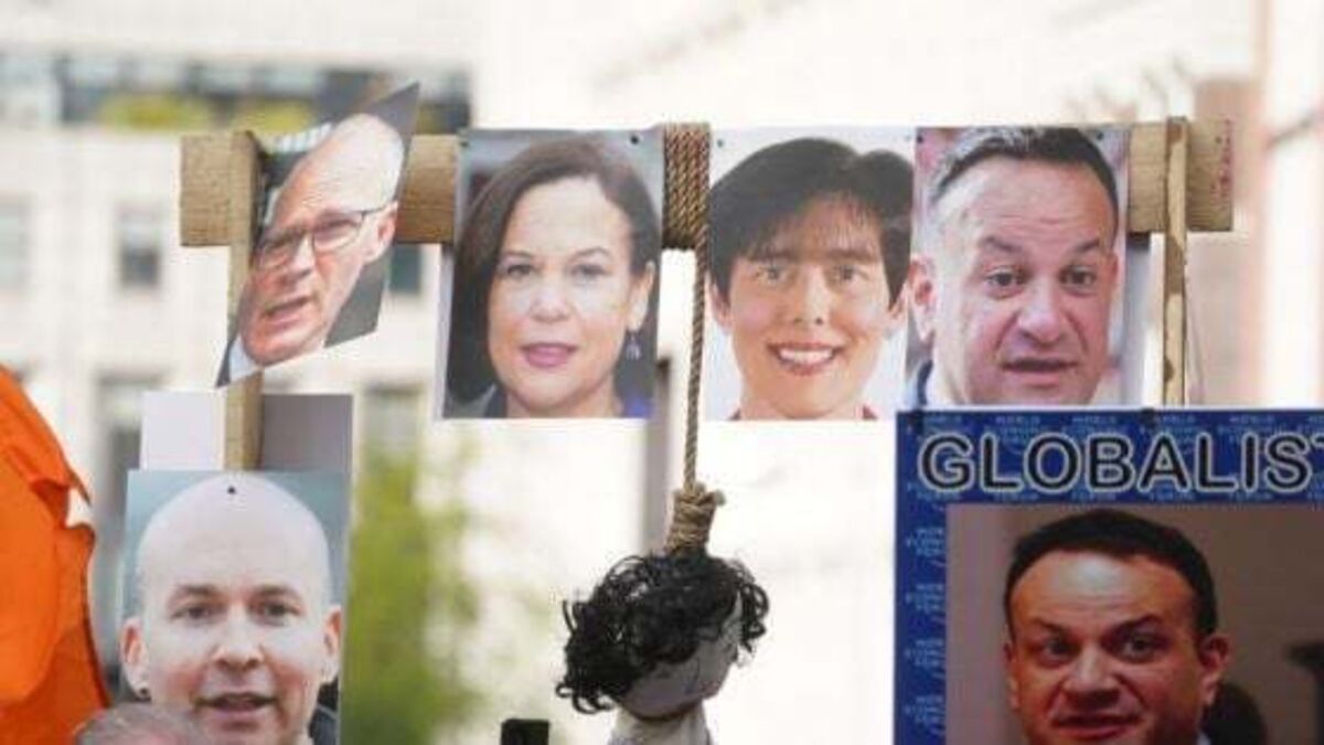 Mock gallows were erected outside Leinster House featuring images of politicians across the political divide, including Taoiseach Leo Varadkar, Sinn Féin leader Mary Lou McDonald and People Before Profit TD Paul Murphy.