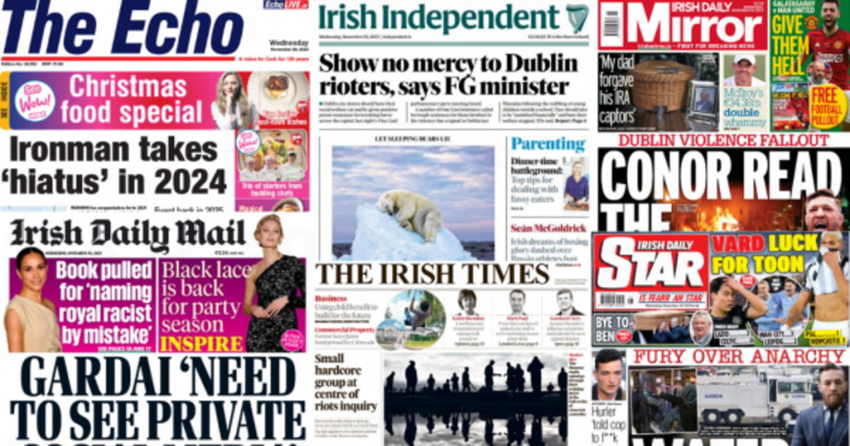 Finally, both the Irish Daily Mirror and Irish Daily Star carry images of Conor McGregor after he was mentioned in the Dáil on Tuesday in relation to his posts on social media during last week's riots in Dublin.