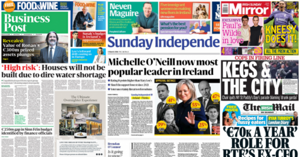 Opinion polls, warnings over water shortages, and a part-time role for a former RTÉ senior executive are some of the stories leading the national papers on Sunday.
