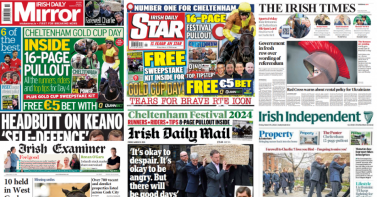 Images from the memorial service of former RTÉ journalist Charlie Bird, continued fallout from the referendums and arrests in connection with a drug operation in Cork occupy the front pages of Friday's newspapers.