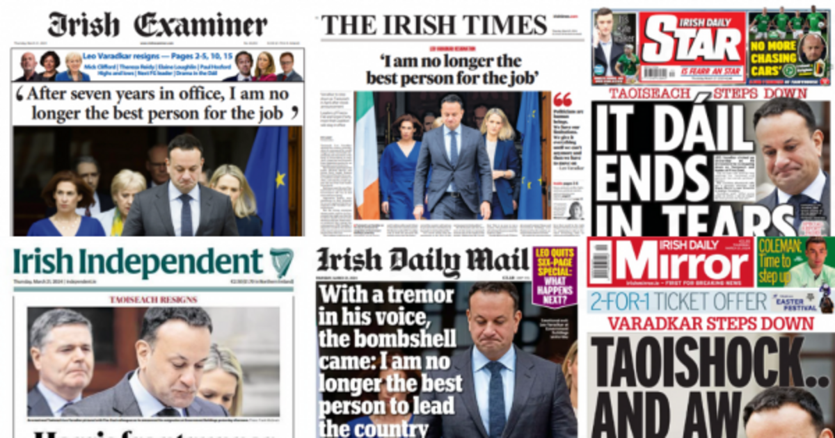 Leo Varadkar's shock resignation leads all of the national papers on Thursday.
