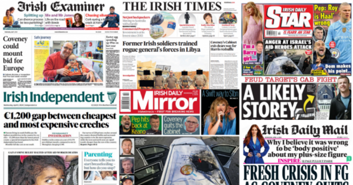 Simon Coveney's decision to leave Cabinet, childcare costs, and the fallout of an Israeli airstrike in Gaza which killed aid workers are covered on the front pages of Wednesday's national newspapers.