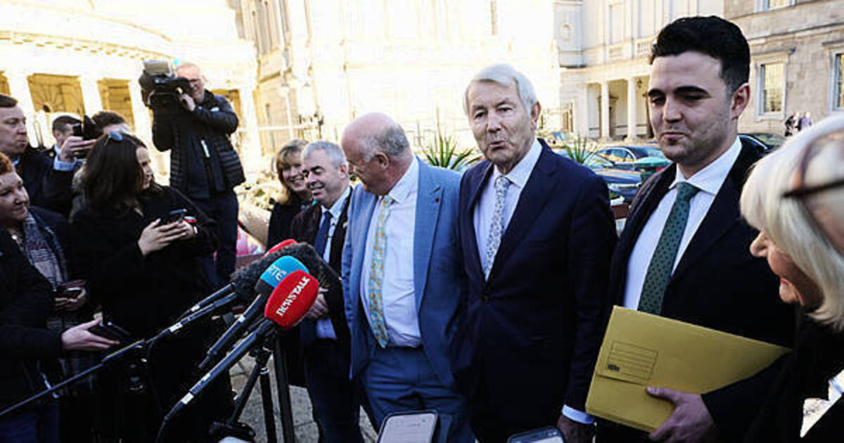Members of the Regional Independent Group Michael Lowry (second right) and (left to right) Gillian Toole, Kevin ‘Boxer’ Moran, Noel Grealish, and Barry Heneghan, speaking to the media at Leinster House. (Brian Lawless/PA)