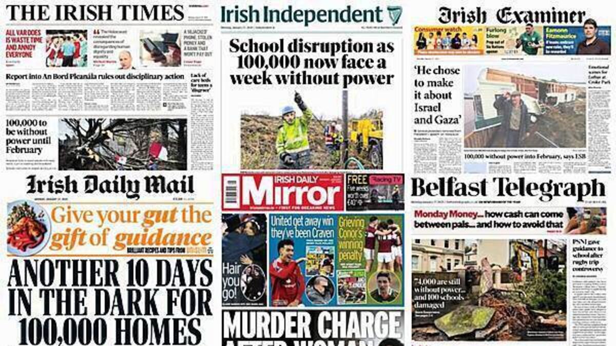 The Irish Times, Irish Daily Mail and Irish Independent lead with the aftermath of Storm Éowyn, as 100,000 homes will be without power until February.