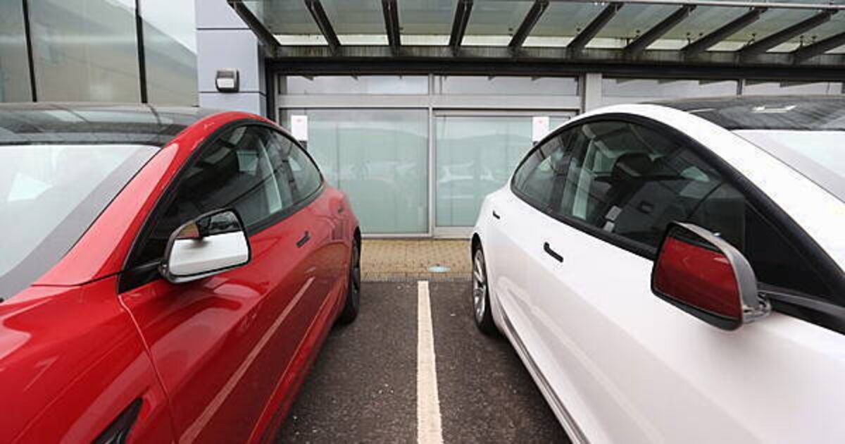 Cars on the forecourt of the Tesla dealership on the Boucher Road in Belfast (Liam McBurney/PA)