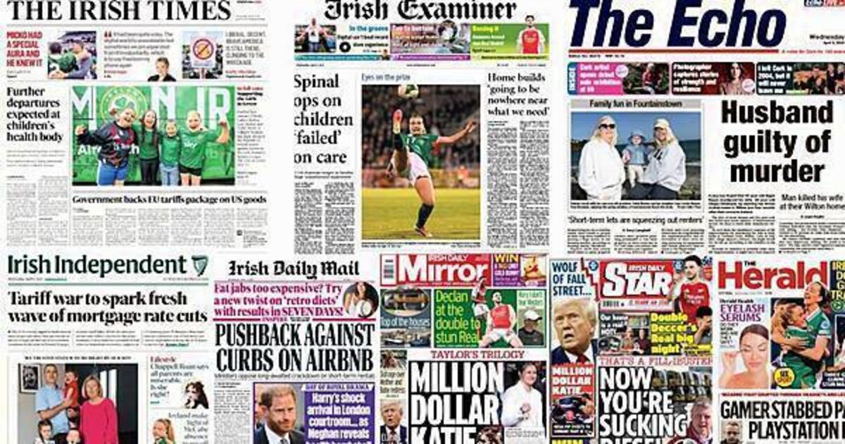 The Irish Independent leads with the ECB being tipped to slash interest rates deeper and faster than previously expected to fight off the risk of an economic slowdown in the wake of Donald Trump's tariff hikes.