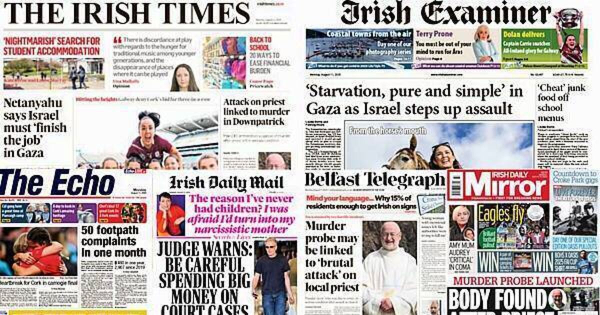 The Irish Times lead with Israeli Prime Minister Binyamin Netanyahu saying Israel must 'finish the job' in Gaza, an attack on a priest being linked to a murder in Co Down, and Galway's win against Cork in the All-Ireland camogie final.