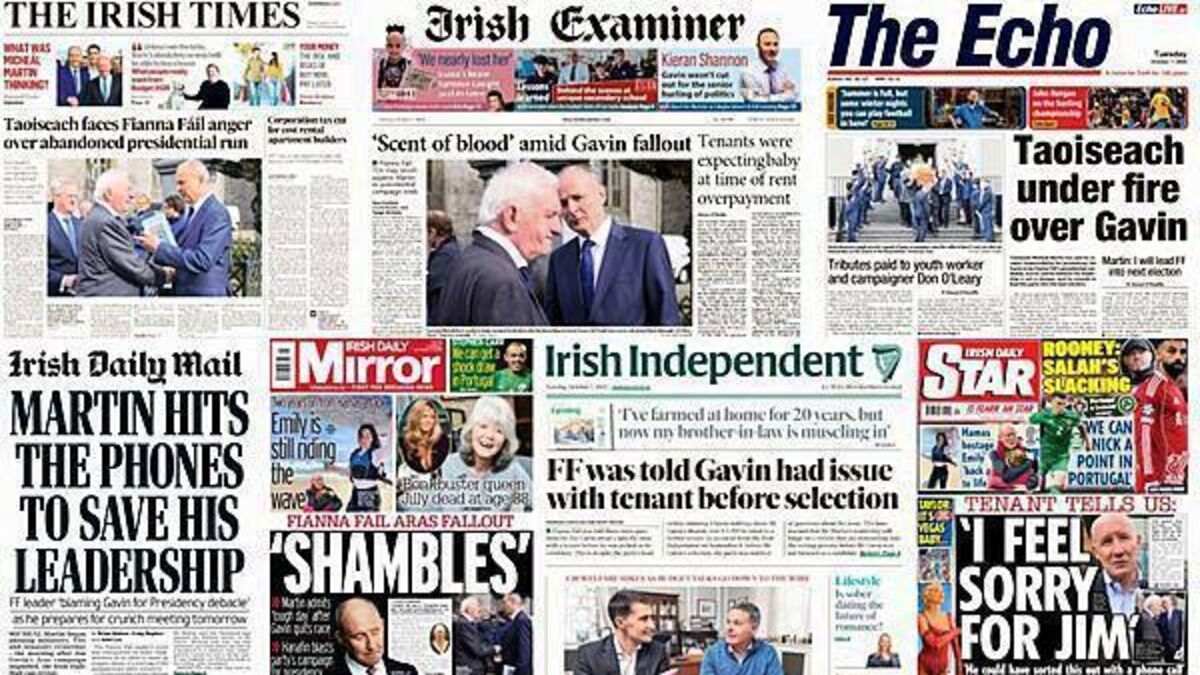 The political fallout after Jim Gavin’s dramatic exit from the presidential election campaign, and how Taoiseach Micheál Martin and Fianna Fáil are handling it, dominates the front pages of Irish newspapers on Tuesday.