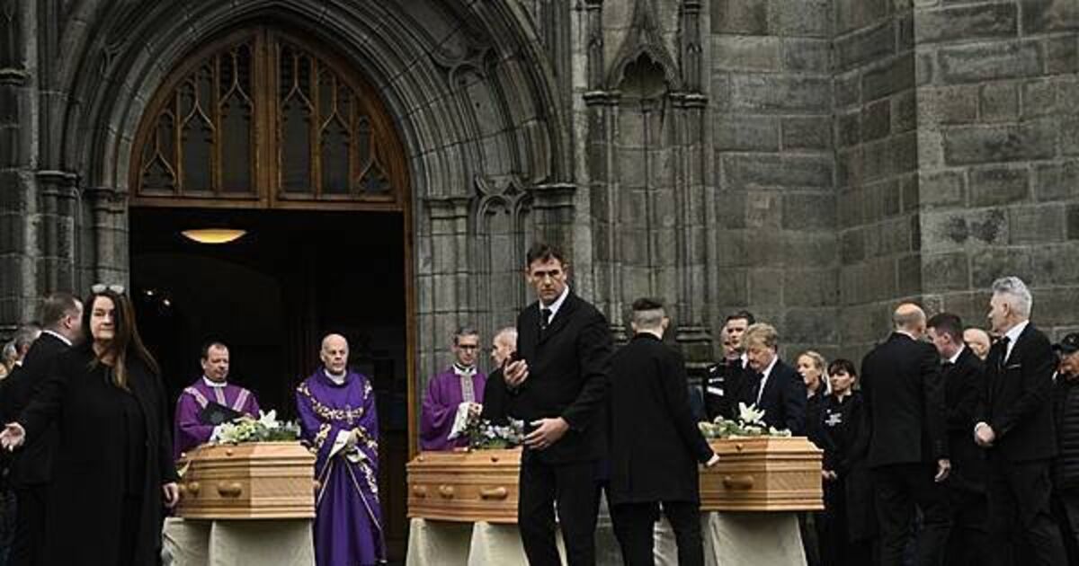 The three wooden coffins were brought to the front of St Patrick’s Church in Dundalk for the funeral mass, where a framed portrait had been placed.