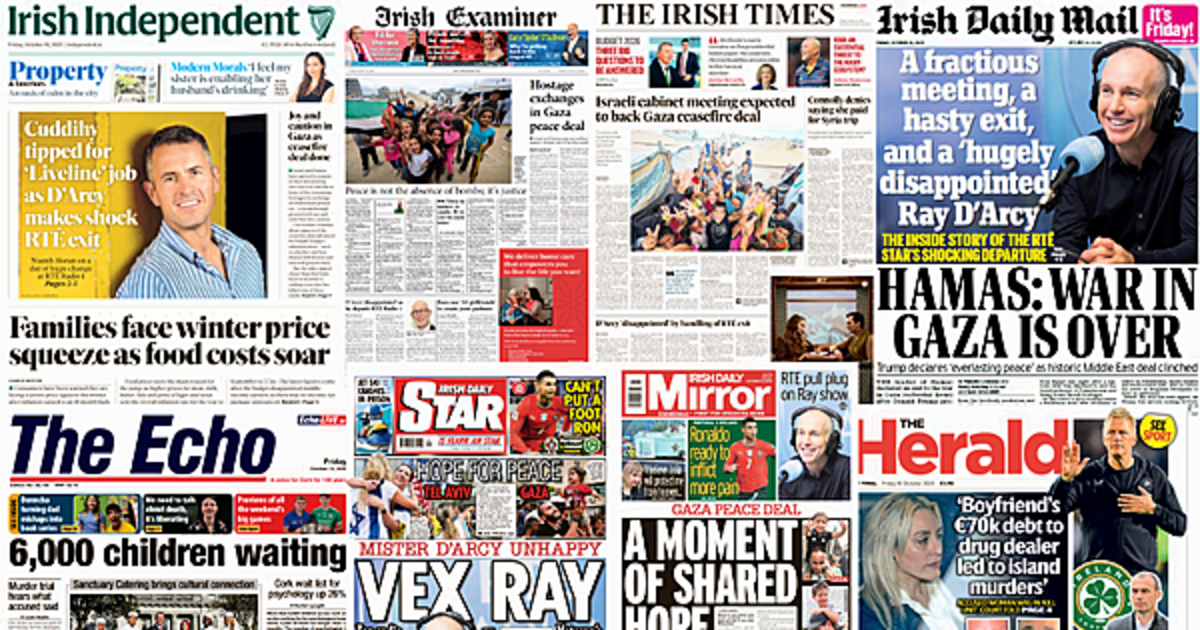 The prospects for peace in Gaza after two years of conflict dominate the front pages, alongside reports on the seemingly fractious departure of Ray D'Arcy from RTÉ.