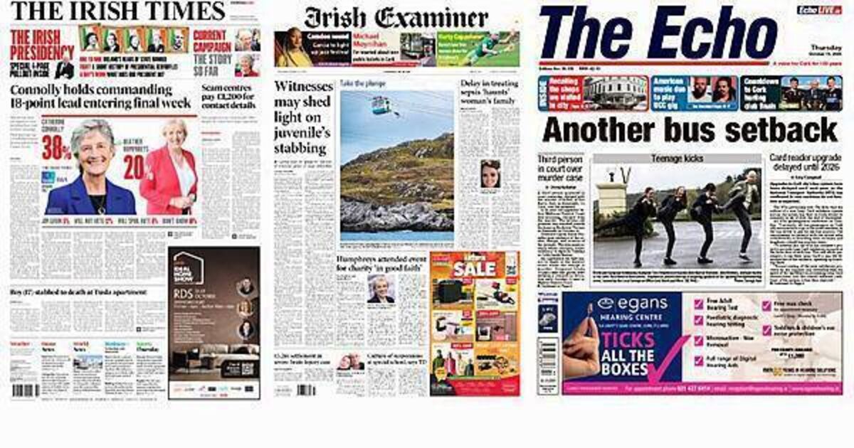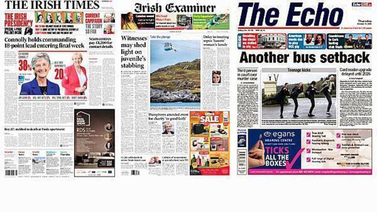 Thursday's front pages focus on a range of stories, from Catherine Connolly holding a commanding lead in the latest poll to witnesses shedding light on the stabbing of a juvenile in Dublin.