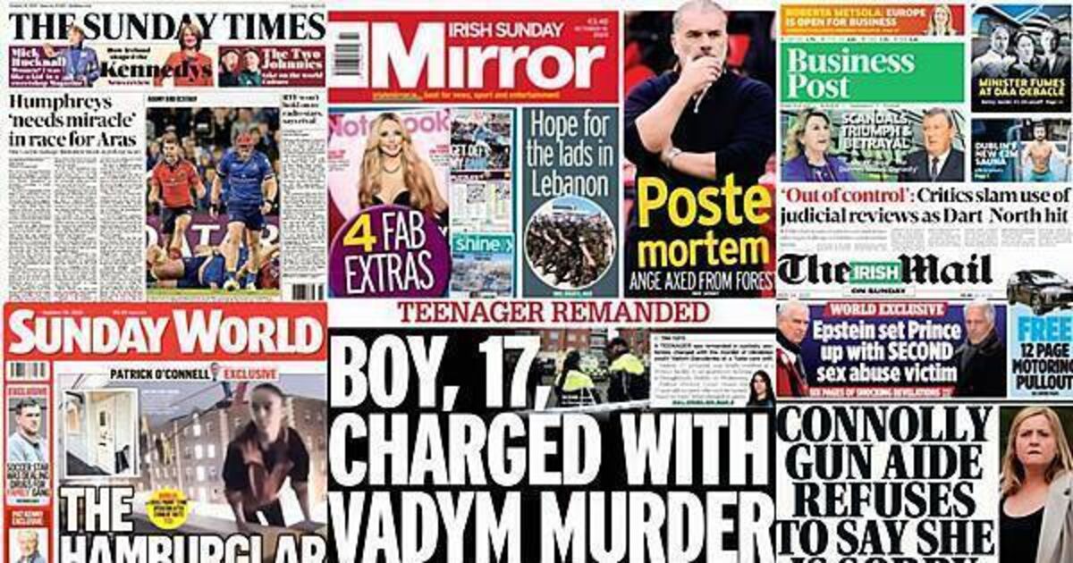 The Irish Sunday Mirror leads with a teenager being remanded in custody on Saturday charged with the murder of Ukrainian teenager Vadym Davydenko at a Tusla care unit in Donaghmede.