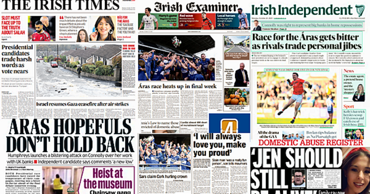 The Irish Times leads with both Catherine Connolly and Heather Humphreys trading words at each other, as Ms Connolly says Ms Humphreys' comments on her work as a barrister were a "new low".