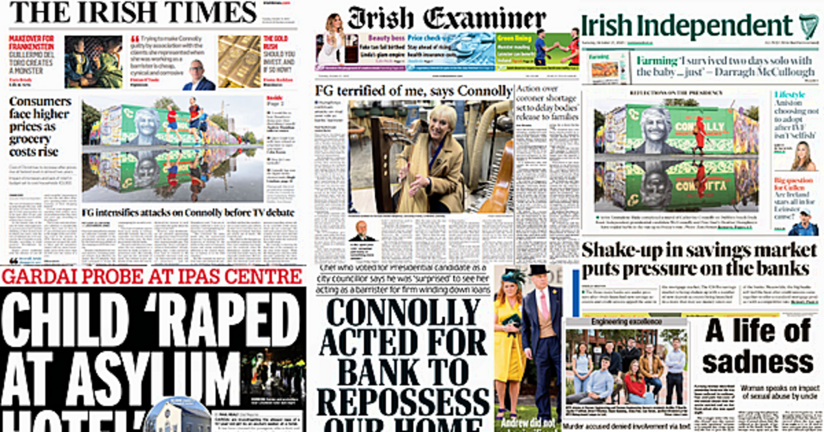 The Irish Examiner leads with Catherine Connolly claiming Fine Gael is terrified of her, as the attacks from Heather Humphreys on Ms Connolly's time as a barrister continue.