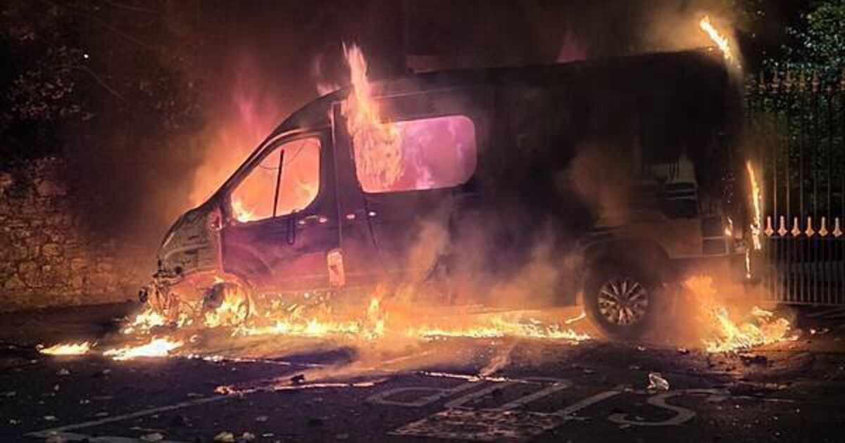 A Garda van was set on fire and fireworks were launched at gardaí as hundreds of people protested outside the Citywest Hotel in Saggart, Dublin this evening.