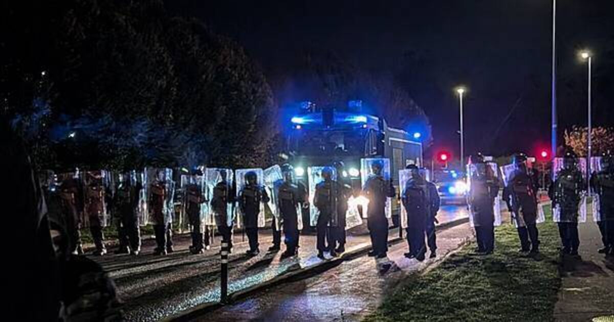 During the earlier disturbances, a large crowd remained in the area until late in the night and public order officers with shields, and some on horseback, moved protesters back.