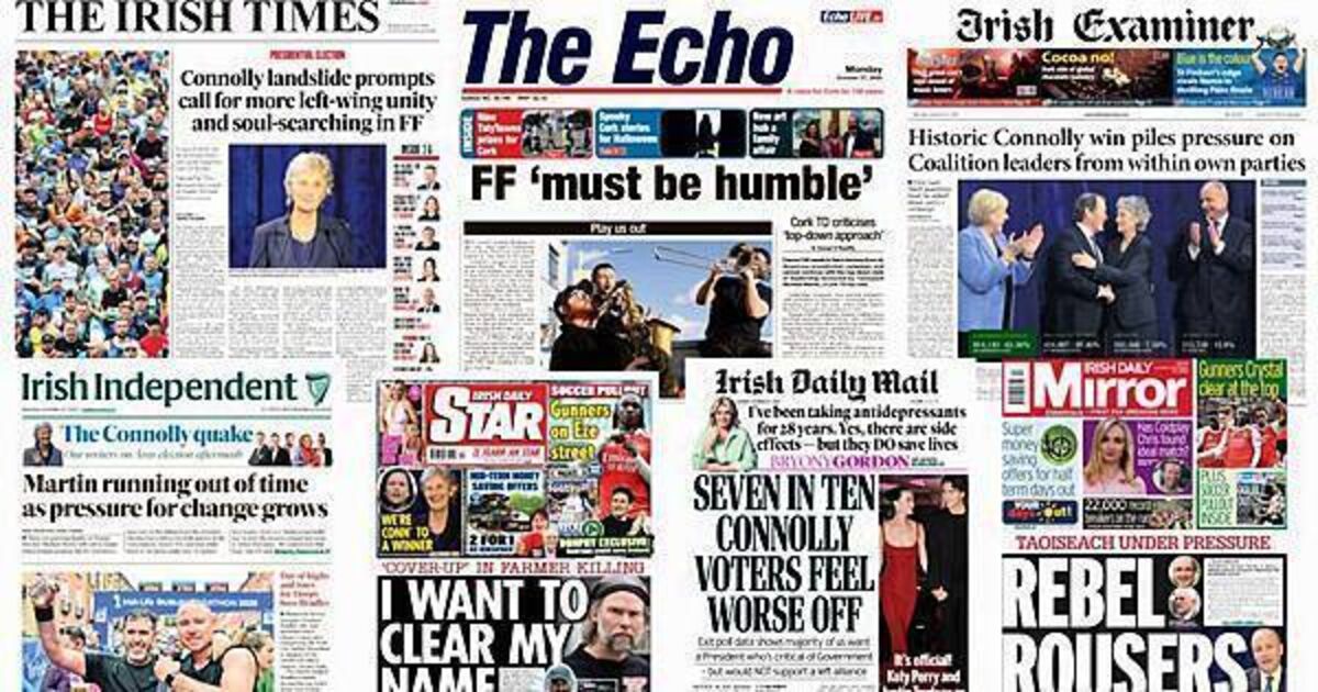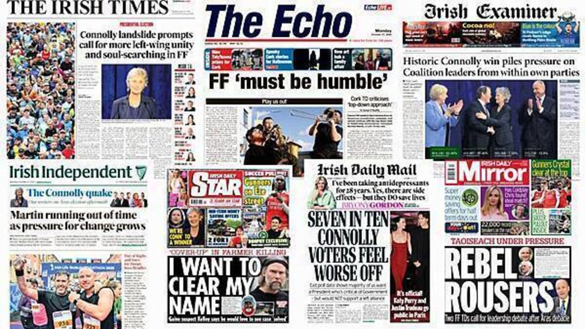 The Irish Times leads with Catherine Connolly's landslide victory prompting more left-wing unity and soul-searching in Fianna Fáil.