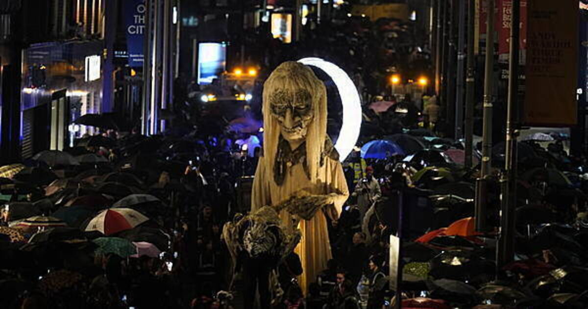The streets were lined with people as musicians played drums and other instruments, leading participants carrying flaming lanterns and spectacular large-scale animal and character puppets from mythology.