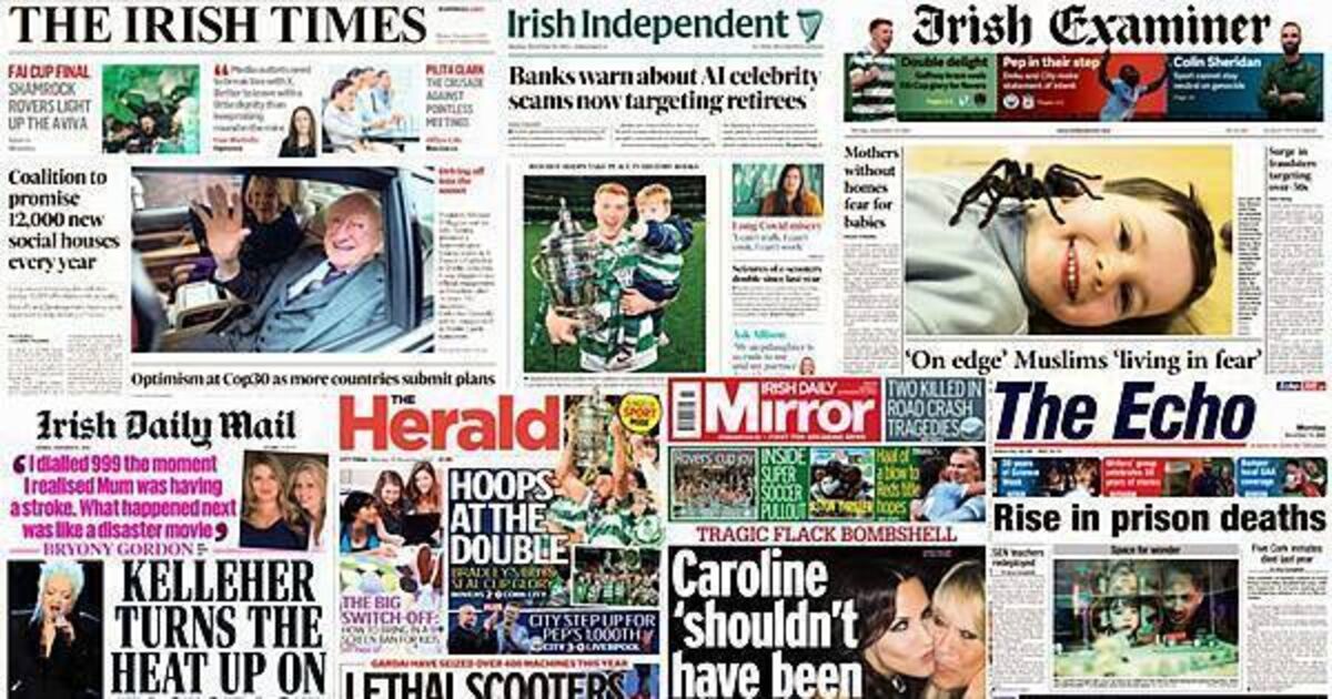 The Irish Independent lead with banks warning about AI celebrity scams targeting retirees.