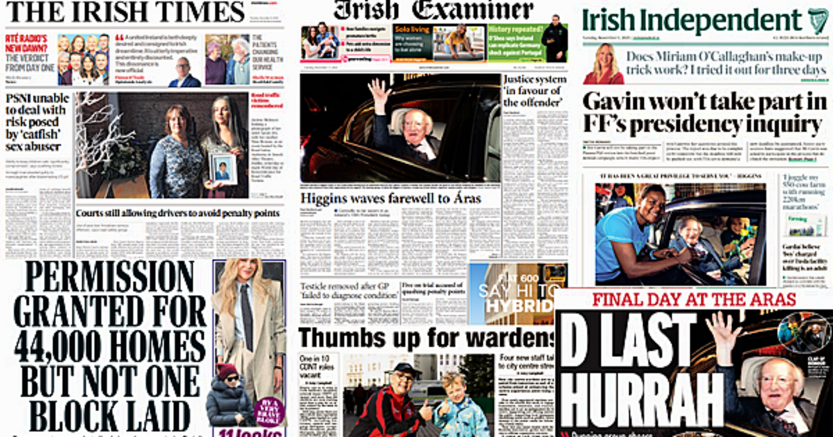 Drivers avoiding penalty points and Michael D Higgins' time as President coming to an end make the front pages of Tuesday's papers.