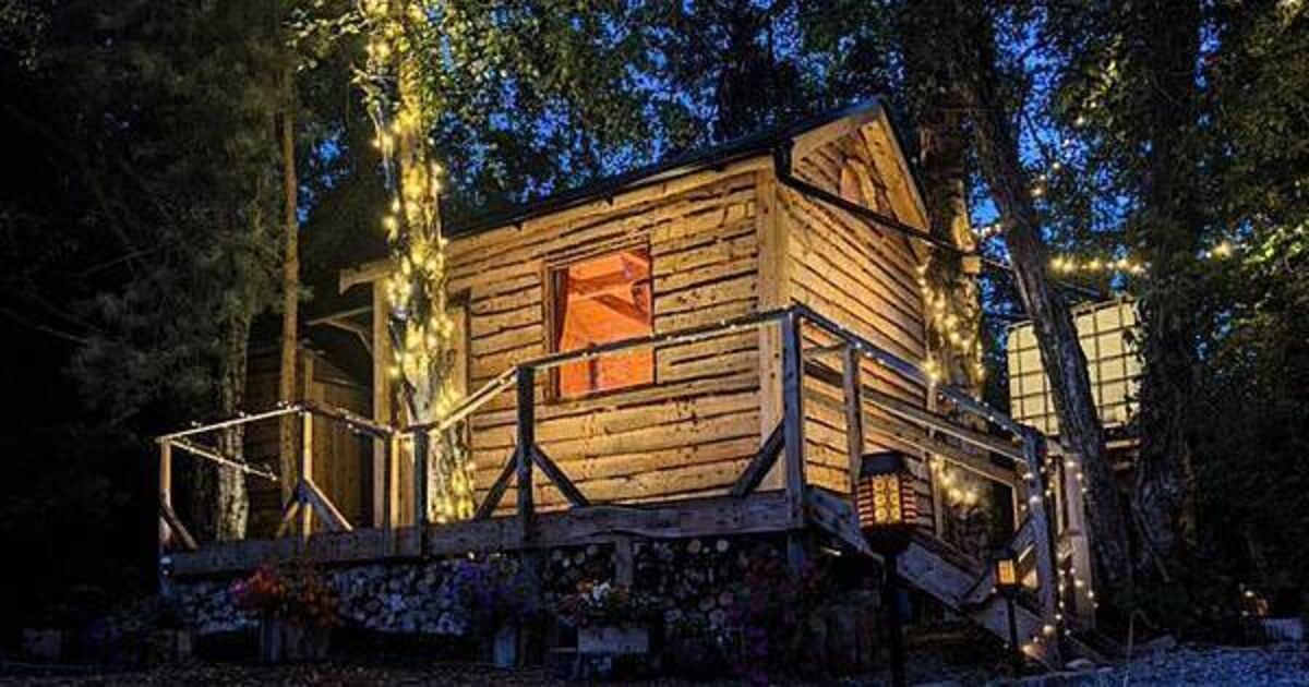 This treehouse sleeps up to four guests, with a hot tub and sauna.