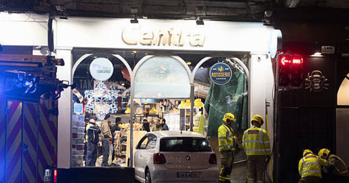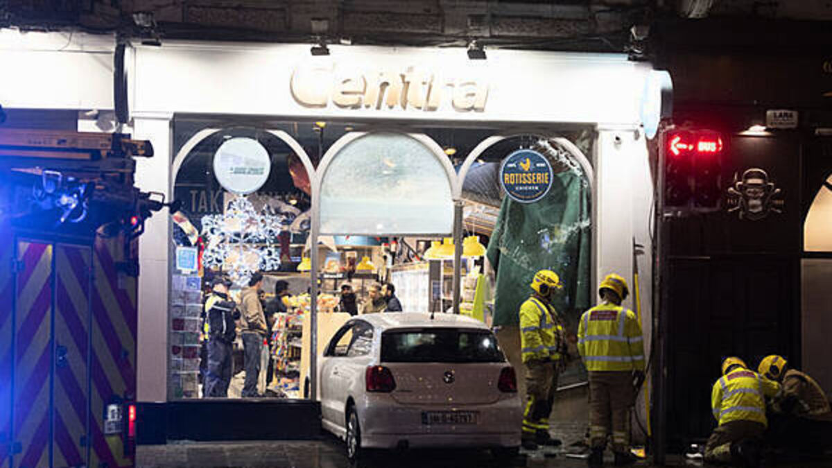 Gardaí and fire services were called to the scene due to a small white hatchback car crashing into the 24-hour Centra located on Dame Street shortly after 9pm on Sunday.