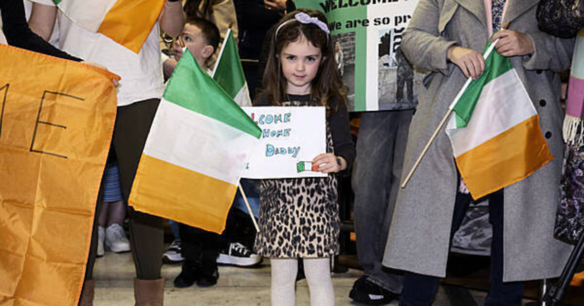 The soldiers’ children, partners and grandparents waved handmade signs and UN and Irish flags in the arrivals hall at Terminal 1 of Dublin Airport.