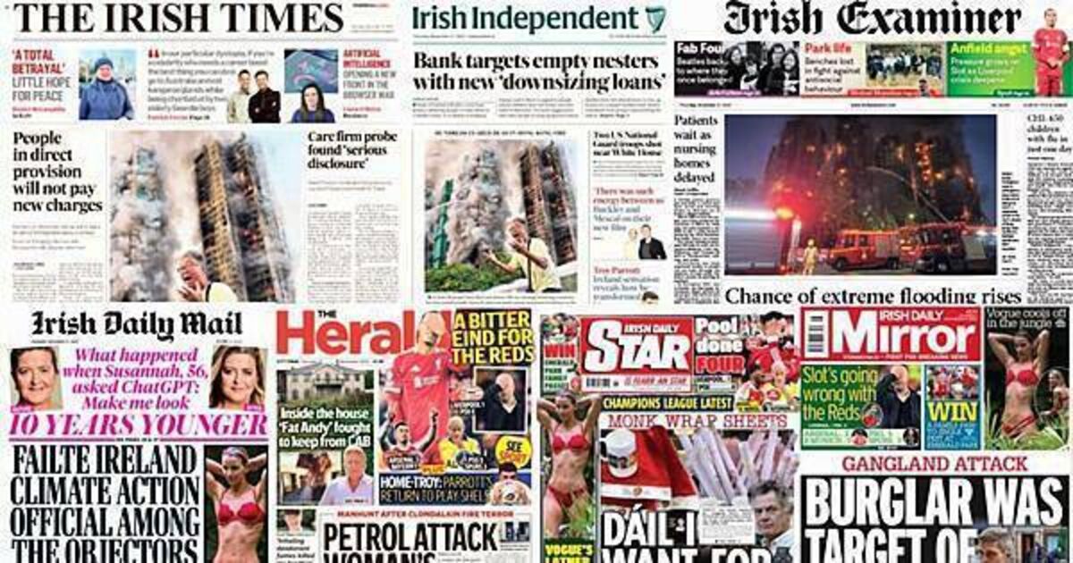 The Irish Times lead with new accommodation charges for asylum seekers not being imposed on thousands living in direct provision, a review into "falsified" garda background checks supplied by a company running emergency housing for vulnerable children in State care, and the woman who was set on fire at her Dublin home, leaving her in critical condition, recently being the subject of what gardaí believe was drugs-related intimidation.