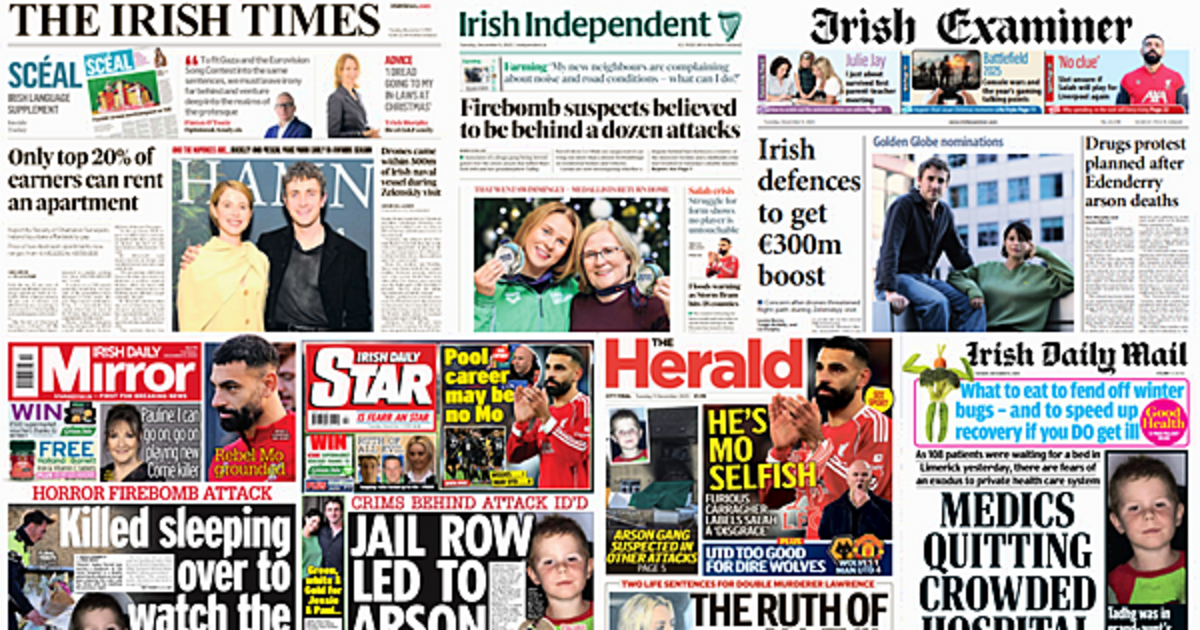 The Irish Times lead with only the top 20 per cent of earners being able to afford to rent an average apartment built in Ireland in 2025, drones having come within 500 metres of an Irish naval vessel during Zelenskiy's visit, and an ex-teacher being jailed for 10 years for sexual abuse.
