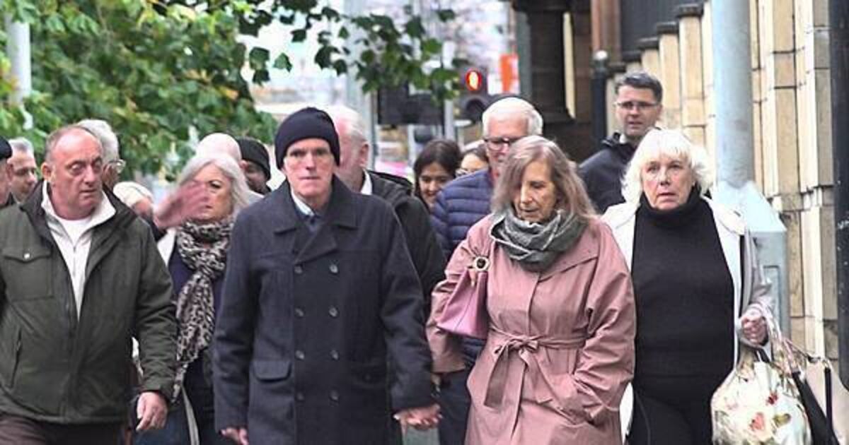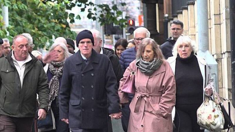 Natalie McNally’s brothers Brendan (centre left) and Declan (centre right) with friends, family members and supporters leaving Belfast High Court in 2023 (PA)