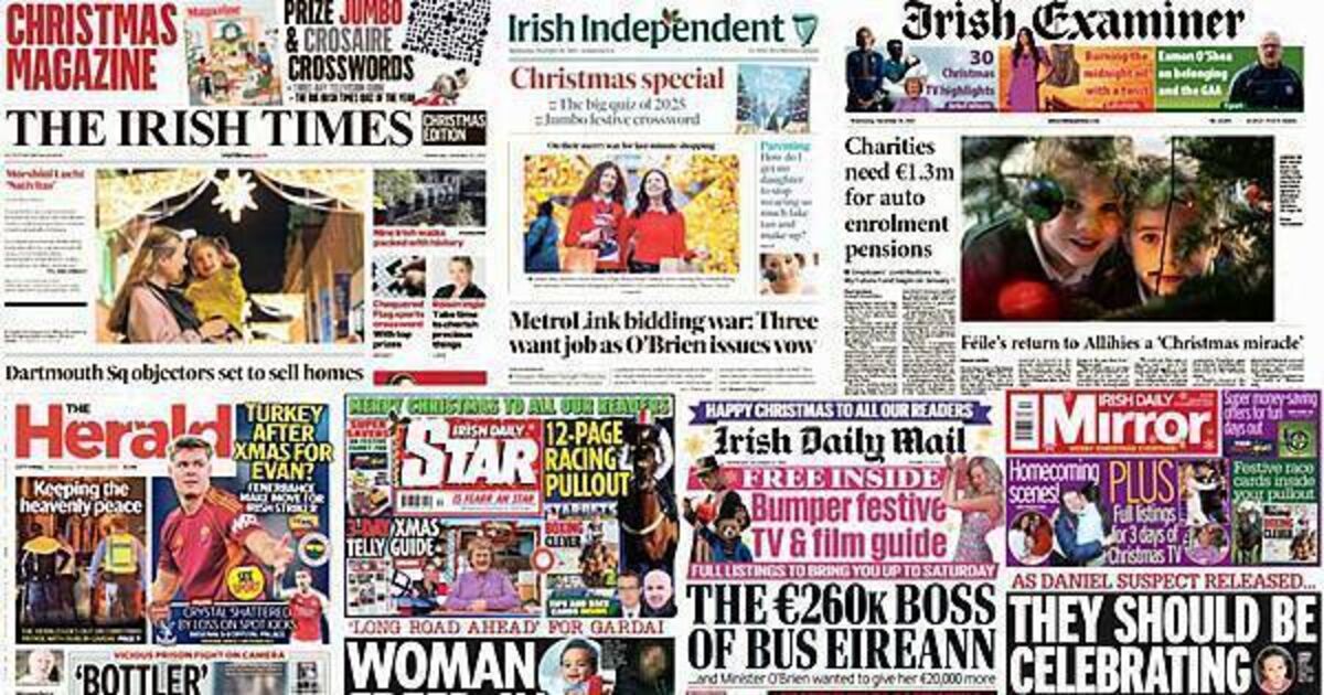A variety of stories, including Dublin's MetroLink, feature on Irish front pages on Christmas Eve.