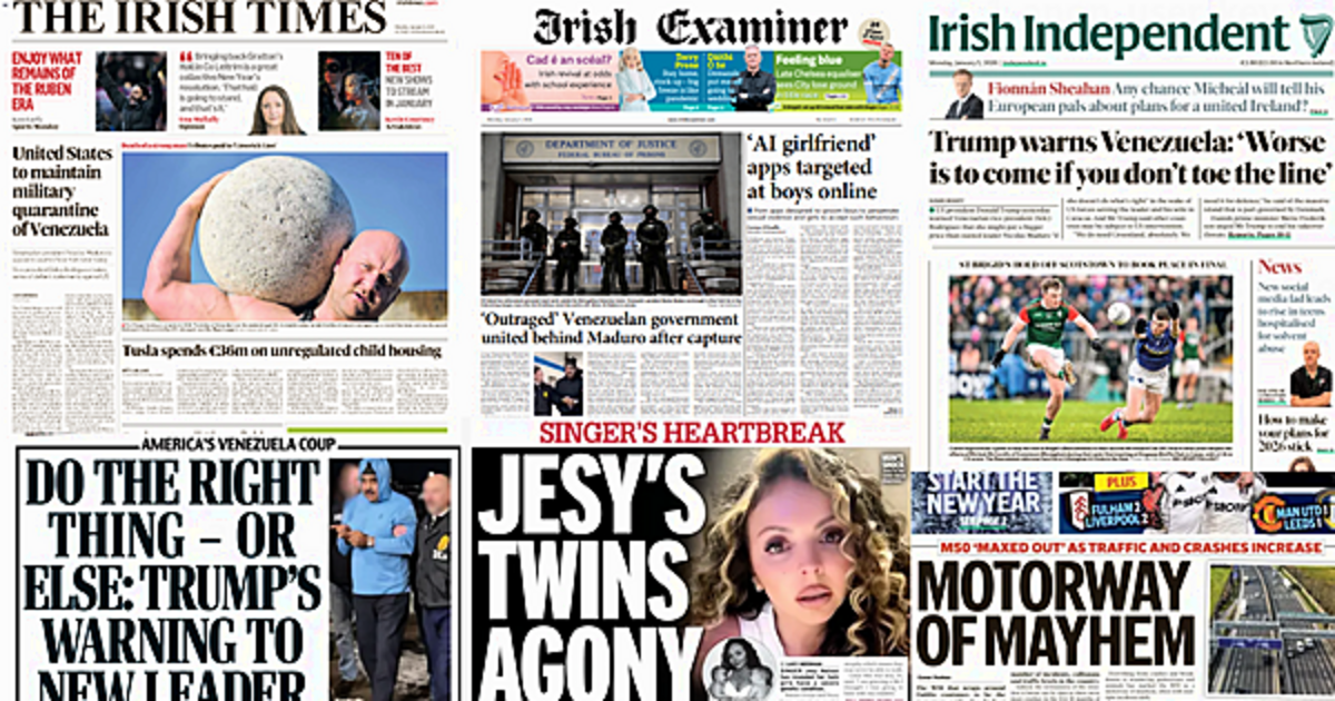 The Irish Daily Mail also leads with Trump's warnings to the Venezuelan vice-president, following the removal of Nicolás Maduro and his wife from the country on Saturday.