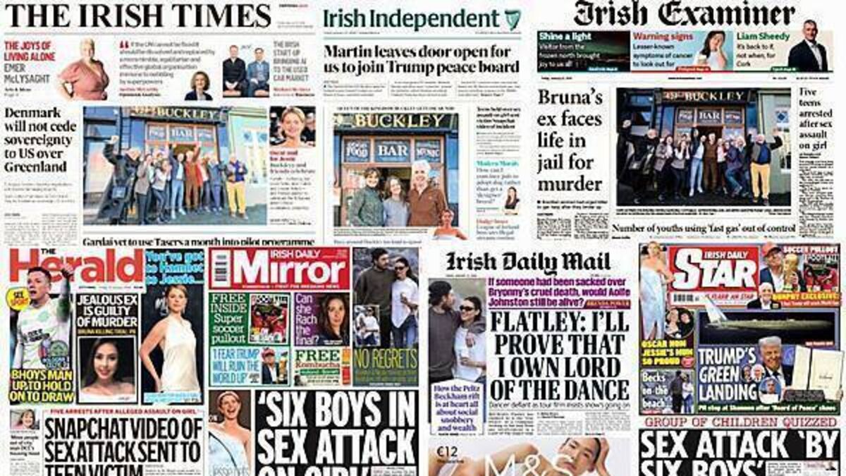 The Irish Times lead with Denmark's prime minister saying Denmark will not cede its sovereignty to the US over Greenland, gardaí having yet to use tasers a month into the pilot programme, and a busy north Dublin road facing a year of traffic restrictions from next month.