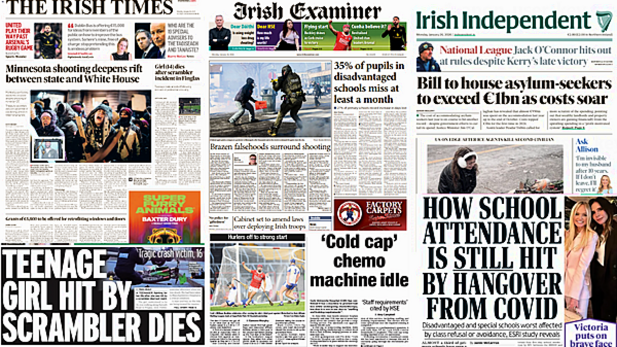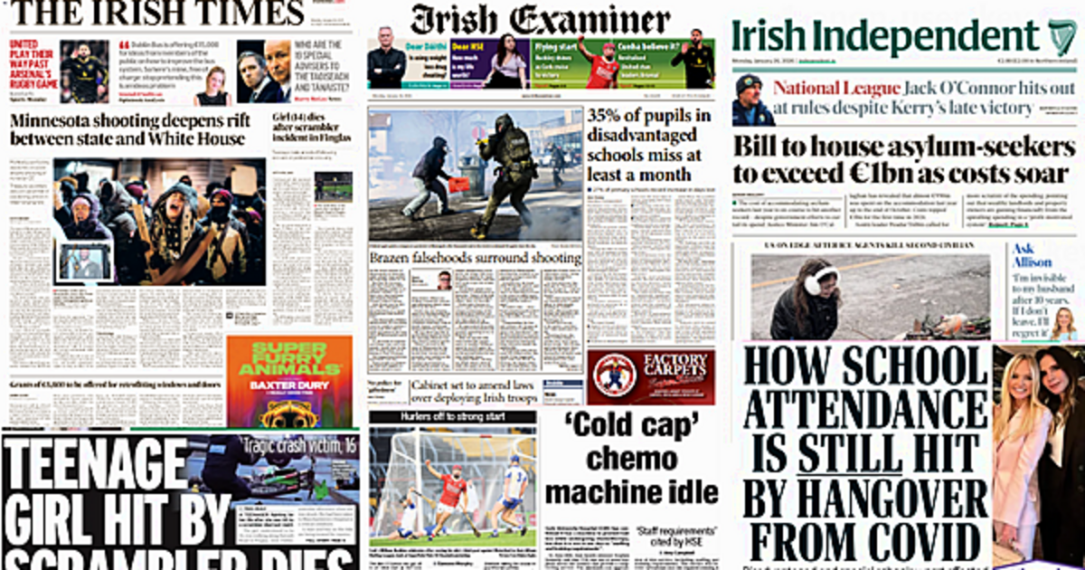 The Irish Times leads with the fatal shooting of Alex Pretti in Minneapolis, which widens the rift between the state and White House