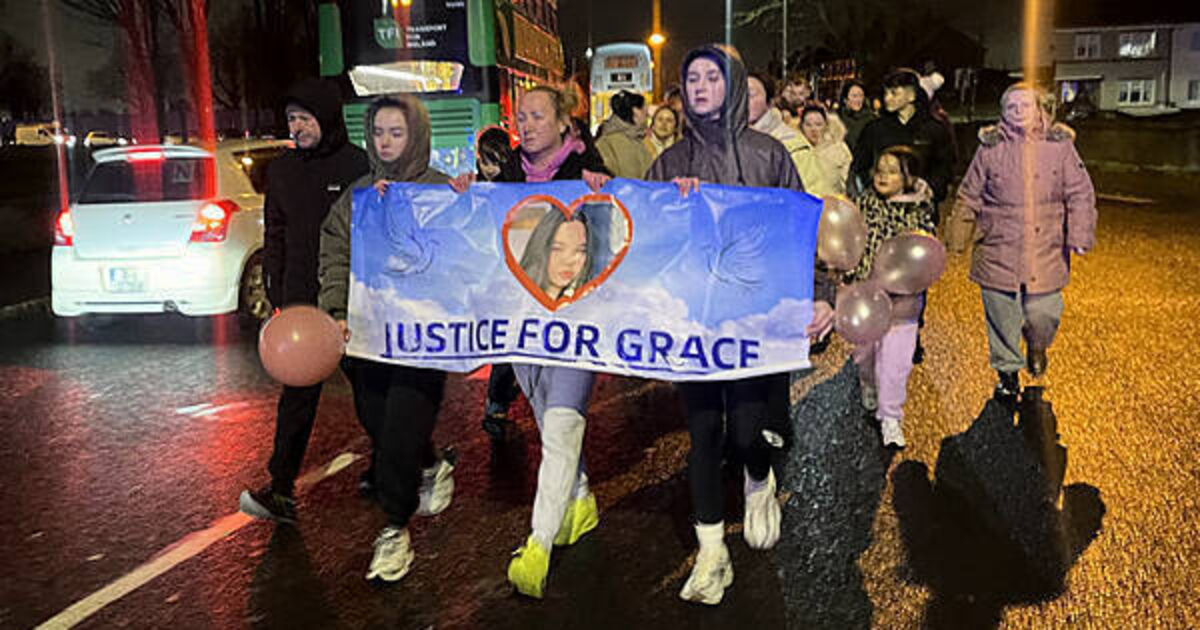 Grace’s mother Siobhan, held a sign with a picture of her daughter with the words “justice for Grace” as she led the walk from Valley Park estate to Plunkett Green.