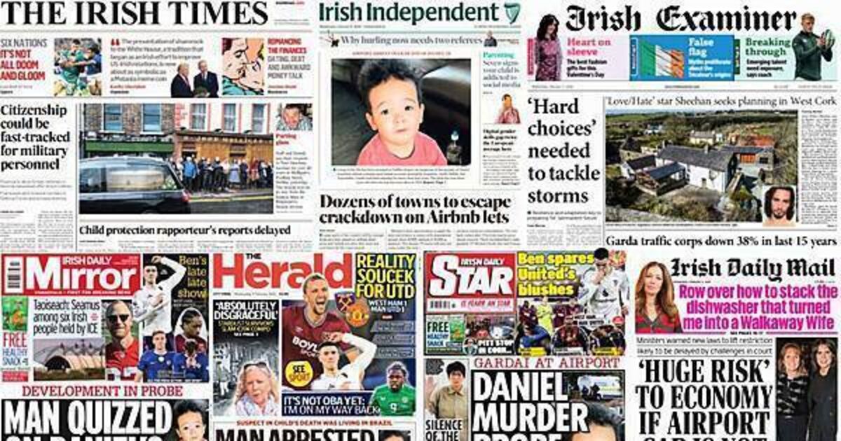 The Irish Times lead with the Government examining plans to fast-track citizenship for immigrants who complete military service in Ireland, reports from the special rapporteur on child protection being delayed, and the arrest of a man in connection with the murder of toddler Daniel Aruebose.
