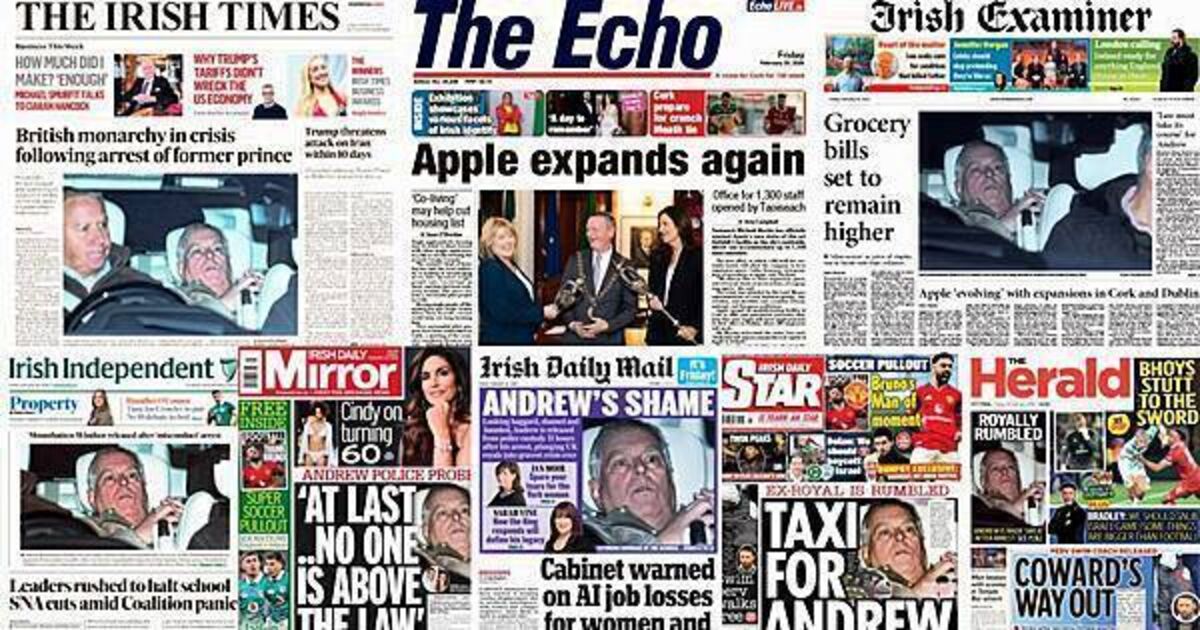 The Irish Daily Mirror leads with, after Andrew's arrest, the family of Virginia Giuffre saying: "At last, today, our broken hearts have been lifted at the news that no-one is above the law, not even royalty."