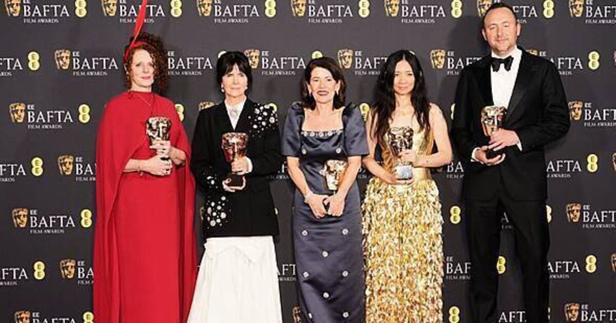 Cast and crew of Hamnet Joe Alwyn, Maggie O’Farrell, Liza Marshall, Dame Pippa Harris, Chloe Zhao, Jacobi Jupe, Jessie Buckley, Olivia Lynes, Bodhi Rae Breathnach, Emily Watson and Nicolas Gonda celebrate winning the outstanding British film award at the Baftas (Ian West/PA)