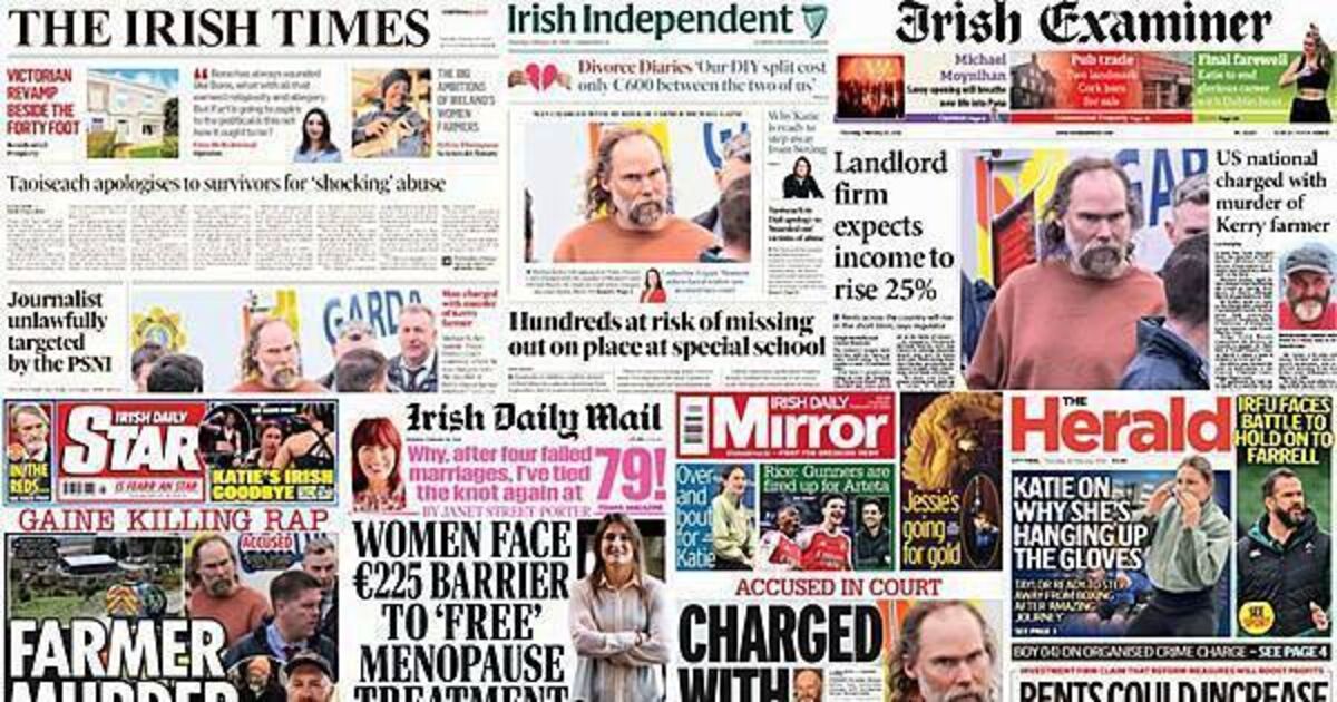 The Irish Examiner lead with the country's largest landlord saying its income could rise by 25 per cent, a US national being charged with the murder of Michael Gaine, and the foreign affairs minister saying there is no risk to Ukrainian president Zelenskyy when he attends the Irish EU summit.
