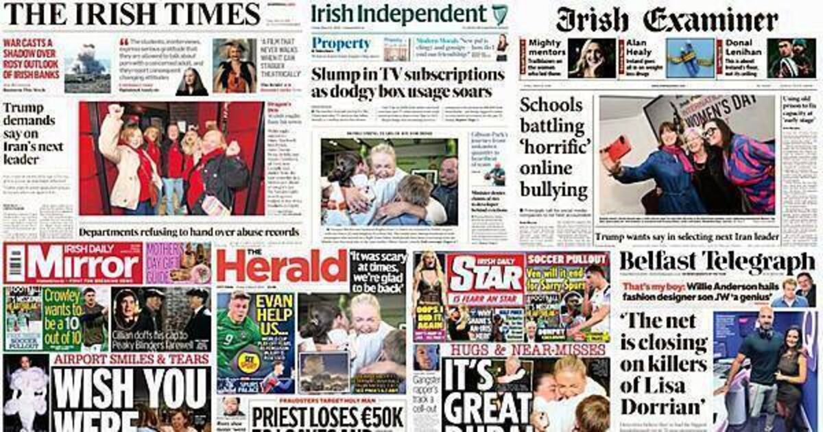A variety of stories feature on Irish front pages on Friday, including US president Donald Trump wanting input on the next leader of Iran, and Irish people coming home from Dubai after the war broke out in the Middle East.