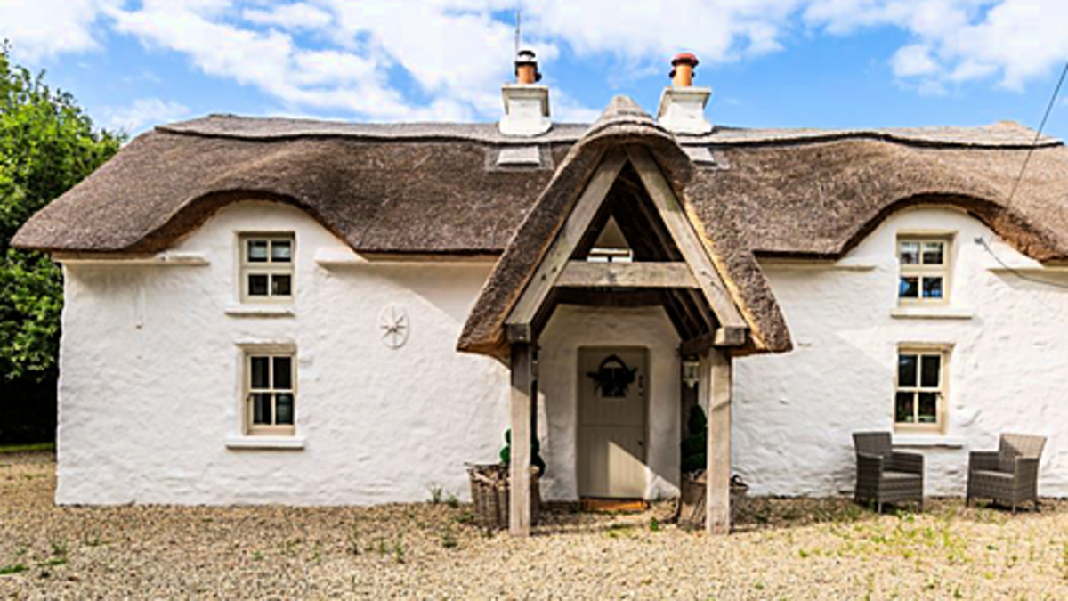 Believed to date from the late 1600s, Wells Cottage is a restored four-bedroom thatched home extending to about 142sq m and set on roughly 1.5 acres. Period features include exposed timber beams, whitewashed walls and traditional fireplaces, while modern updates have added a spacious kitchen and bright living areas. The grounds include mature gardens and lawned areas, with Gorey and the M11 less than 15 minutes away.