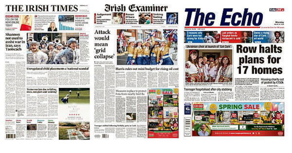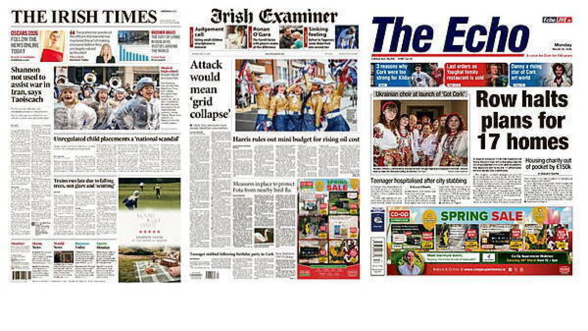 Monday's front pages focus on a range of stories, from the Taoiseach saying Shannon Airport is not being used to assist the war in Iran to an attack on energy infrastructure leading to a collapse.